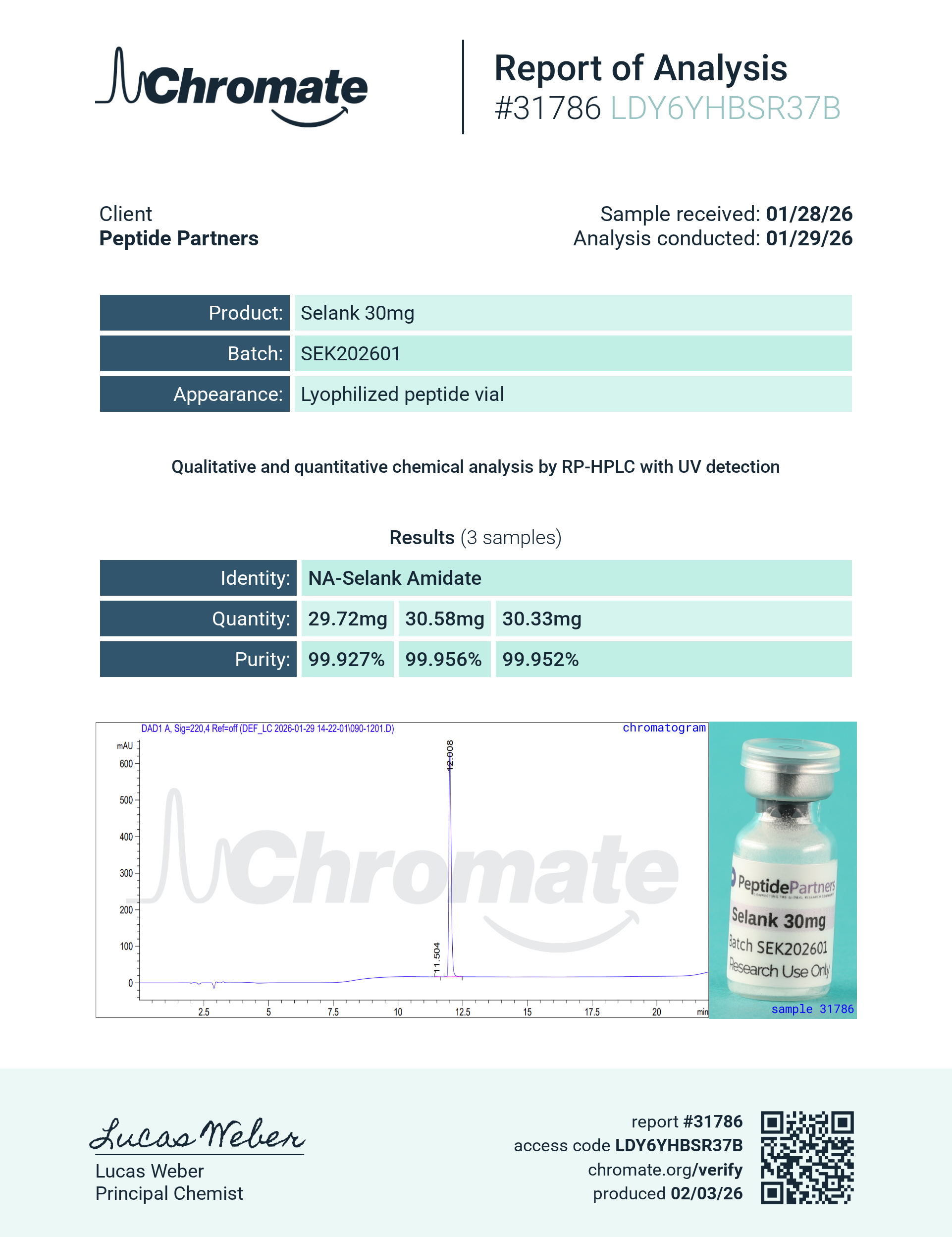 | Selank | SEK202601 | VI32 | 2026-01-29 | 99.94% | Chromate | View File |